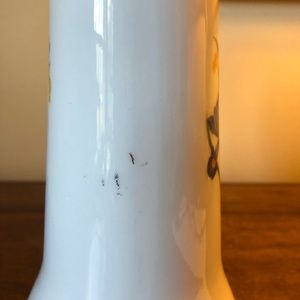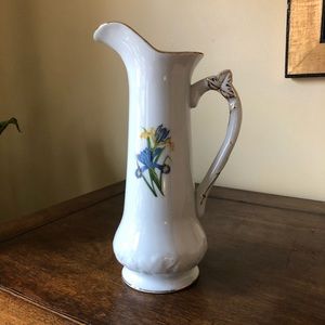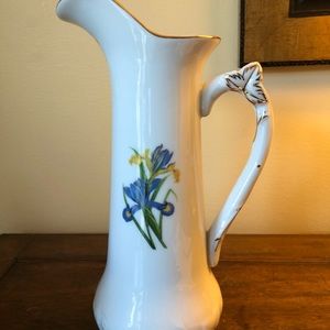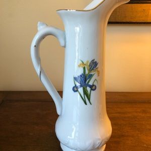 White china pitcher with Iris design. Small gold brush marks as seen in photo. Made by Formalities by Baum Bros.