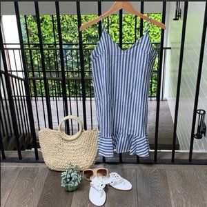 Boho Blue Striped Ruffle Hem Dress, XS 00/0/2
