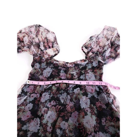 Color Black Floral. Dance the night away in this so sweet babydoll mini dress from For Love & Lemons featuring a moody floral print organza overlay with statement puff sleeves. Self: 100% poly. Lining: 97% poly, 3% spandex. Dry clean only. Fully lined. Organza fabric. Adjustable ruched bust. Buttoned elastic sleeves. Side zipper closure.Measured flat/approx.