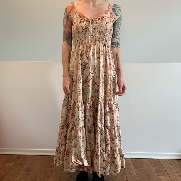 Sort of an unusual piece for Betsy Johnson, an older piece circa 2009. This charmeuse maxi has a smocked bodice and spaghetti straps with dusty rose lace and a ribbon tie at the neckline, and a loose tiered skirt. Off-white with a delicate vintage-inspired floral and subtle skull print. Slips on easily. Only been worn once. Would look better on someone taller than very short me. Like the model in this photo.