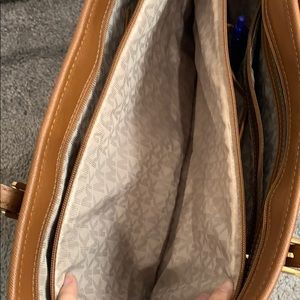 In excellent condition. Timeless saffiano leather composes a sturdy Michael Kors tote. Gold-tone hardware adds shine, and slim strap handles carry over the open top line. A large zip pouch divides the interior, and 5 notch pockets and a zip compartment outfit the logo-lined interior. Dust bag included.