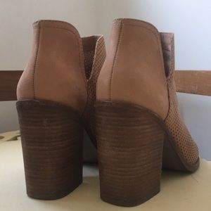 Genuine leather open toed boogie with chunky heel and woven leather detail. In very good condition with minimal wear to both bootie and sole. Only worn outside a couple of times.