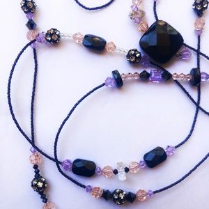 74" long embellished with semi-precious gemstones, pink, purple and clear Swarovski Crystals and an assortment of other stones in various shapes and unique color combinations.