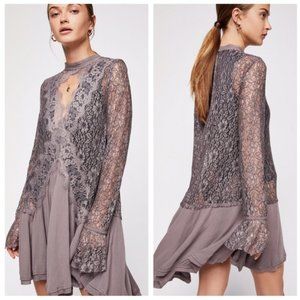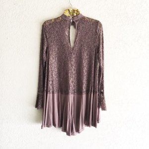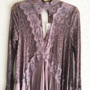 Romantic lace and crepe pieced tunic with a swingy silhouette. Front and back keyhole cutouts with mother of pearl button closures at nape and fluted bell cuffs. Sheer lace top and sleeves with crinkly crepe skirt. Purple hazy color.