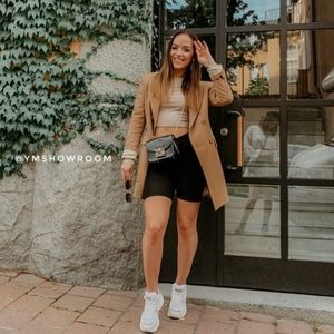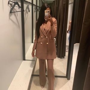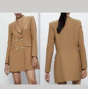 Double breasted buttoned frock coat with lapel collar and pronounced shoulders.