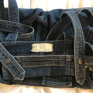 Distressed wash skinny denim overalls. 5-pocket style. Adjustable crisscross straps. Pocket detailing on front bib.