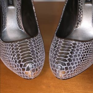 White House Black Market Rece Heels; shimmering silver reptile like print ; 4” heel; only worn once; one area if peeling inside shoe from price tag removal; very clean, EUC with original box!
