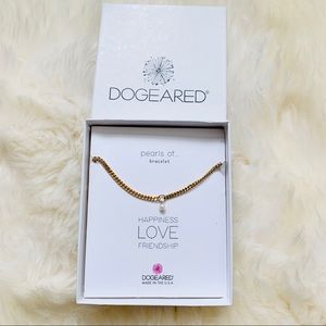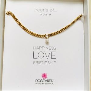 This NWOT Dogeared Pearls of Happiness Bracelet features an 14K single gold-dipped chain and two tiny pearls (one charm pearl, and one at bracelet extender). Never worn, but tried on!