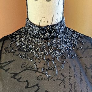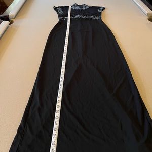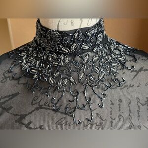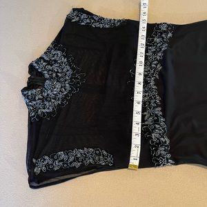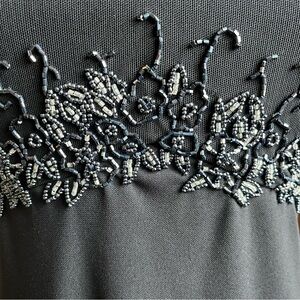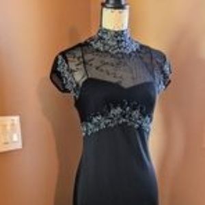 This dress is absolutely stunning on! Black outer shell is polyester with shear upper and velvet camisole showing through. Exquisitely detailed with blue and silver beading. 👀 Amazing! Thank you for looking.