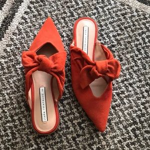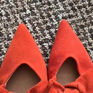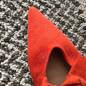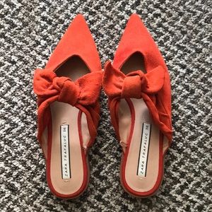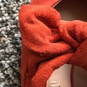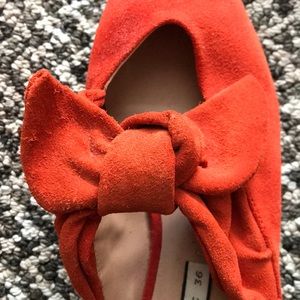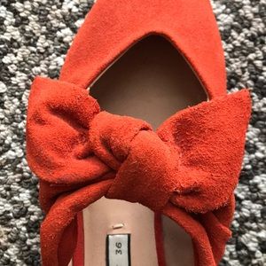 Zara trafaluc flats. Burnt orange color with bow tie on top. Have some smudges on them and a slight stain on. top right shoe (shown in pics) but otherwise good condition! Size 6