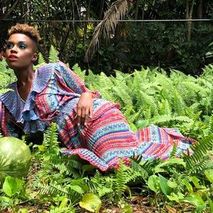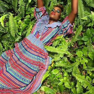 Freis's signature is represented by multicolored prints applied to one-size, easy-care dresses, primarily designed in polyester.