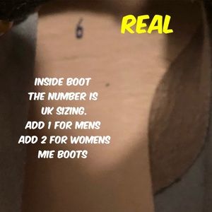 REAL Made in England DM ..Notice the 'yellow stitching' is nice and thick, and will often overlap where its cut. Photo 6: Real 'Made in England" will have info 'on' the tongue , not on a tag. some wear off, depends on age. refer to Photo 8 for size , these can be worn off too, but all Real DM "Made in England' will have it in both places when they are made.