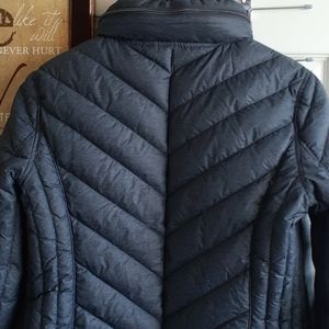 Packable down filled jacket. Lightweight for spring. Steel grayish blue color. Has a hood if needed.