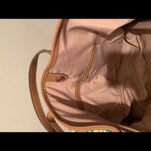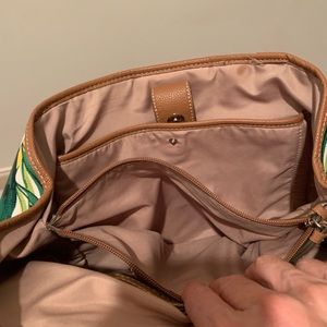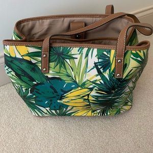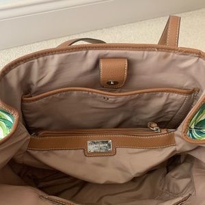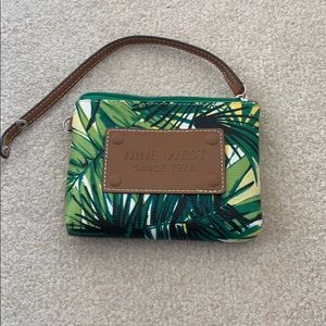 Nine West ladies purse. Foliage printed vinyl with leather trim. Divided sections inside. Multiple pockets. Includes small matching coin purse. Used but in very good condition.