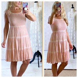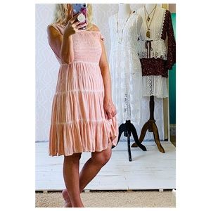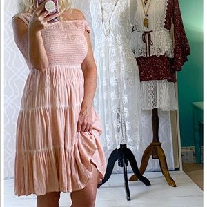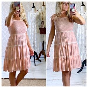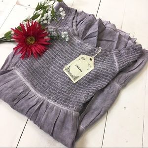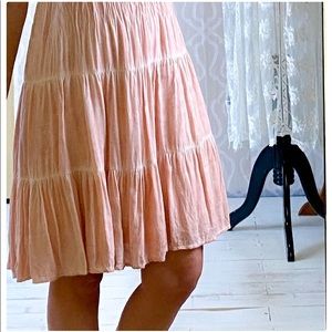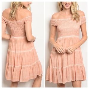 Easy Wear/Pullover, Mineral Washed, Elastic/Smocked Bodice, Sleeves- Up or "cold shoulder", 3 Tiers with the Lining give the Skirt a slight Flare.