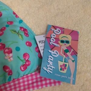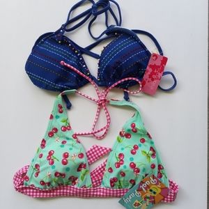 Bundle of 2 . One top with cute cherry design with aqua color. Other top dark blue with different color stripes with decor around neck as seen on picture.