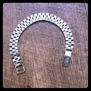Good condition men’s stainless steel bracelet! It’s approximately 8” in length. May need a little cleaning. It’s a little wear on the clasp but a little cleaning will do the trick.