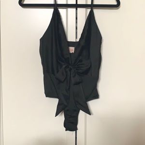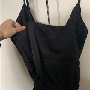 Worn once for an event. Material is a satiny/silk. I am selling the black color - other pics for fit and style. Adjustable straps. Snap crotch. Side zipper. Bow is adjustable. Very sexy and stylish at the same time. Pairs perfectly with high waisted pants or skirts! Size is UK 2.