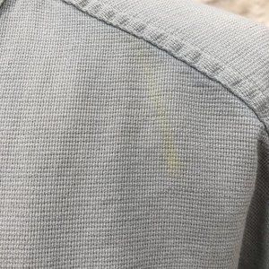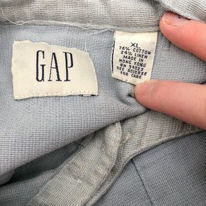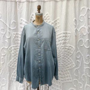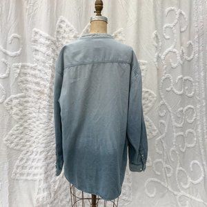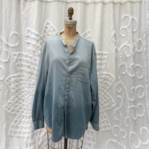 Ombré dyed button up soft linen oversized shirt. This shirt is a preowned, gently worn item that has been given a second life through hand-dyeing and distressing.