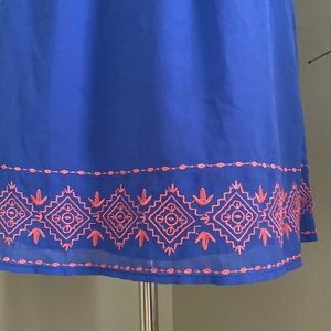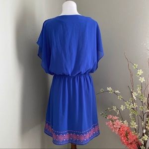Miami from Francesca’s collections blue dress with pink embroidery along hemline. Short sleeve, blouson style with elastic waist. Excellent condition!