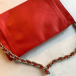 Elliott Lucca red envelope clutch. Originally purchased at Nordstrom, used once. Red leather exterior, gold tone hardware, gold and leather chain strap, and silk-like patterned interior. Interior zippered pocket. Chain is removable via lobster claw closures or can be worn as shoulder bag. Bag is approx 8.5” x 11.5”. Chain strap is 32”.