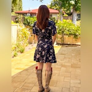Flare sleeves fall into a wrap waist and v-neckline. This is an actual wrap dress. It fully opens and wraps around.