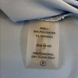 Pretty light blue silky top. Tag says dry clean, but I wash in cold water in gentle and hang to dry.
