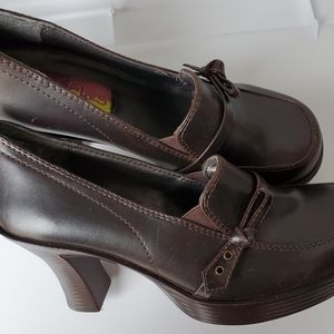 Brand new never worn. All manmade. Brown with a bow and 2 inch heel
