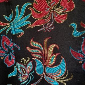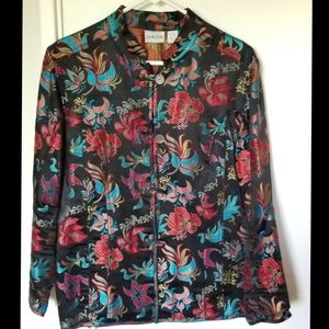 Gorgeous black silk blend jacket by Chico's. Brilliant floral embroidery in contrasting red and blues, this beauty hits just below the waist and has full sleeves. A Mandarin collar and frog button closures lend an Asian flare to an amazing piece that cam be dressed up with a slim pencil skirt or down with a simple white tshirt and jeans. Excellent, gently worn condition.