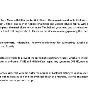Cloth Bandit Face Mask with Filter pocket & 2 filters. Filters are silver and copper infused. See full description in picture. Roomy, for ease of breathing and air flow. Do not pull on your ears. Adjustable.