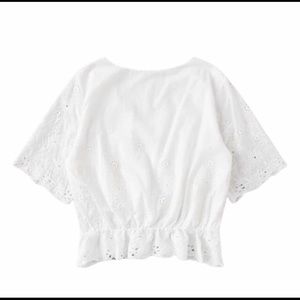 Boho plus white eyelet top, elastic waist, ruffle hem, short sleeve.