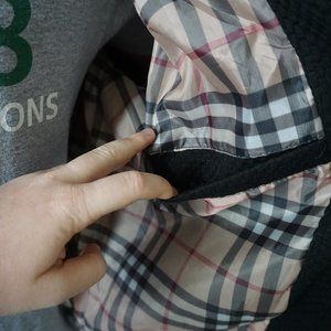 Black bomber jacket, plaid liner, inside pocket, gold zipper