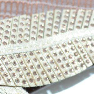 Offered is this darling pair of Carlos Santana sandals. The strappy thong sandals feature a glittery light honey gold rhinestone feather leaf, buckle closure, & 1" heel. The sandals are new with stickers & wraps but do not have a price tag attached but remain unworn.