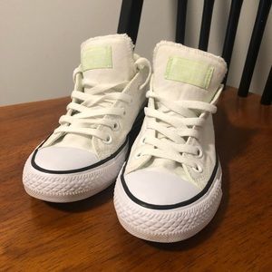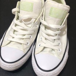 These had minimal wear and I did give them a good wash and have not worn them since. Super cute but to narrow for my feet! Great condition! White base with a pale green hue accent