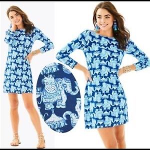 Lilly Pulitzer Sophie Dress. “Joy Ride Elephants” Deep Indigo. Super soft, stretchy and comfy!! UPF 50+ protection protects you from the sun while keeping you looking great! Printed dress with boat neckline. Logo stamped Gold button detail on shoulder & cuff. Excellent used condition, no stains holes or shrinking. Very minimal usage wear. Approximate measurements laying flat: Bust 14.5” Length from shoulder 31”. NO Trades Retail $138