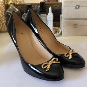 Black patent leather Kate spade heels with gold bow detail and the toe! Absolutely adorable!