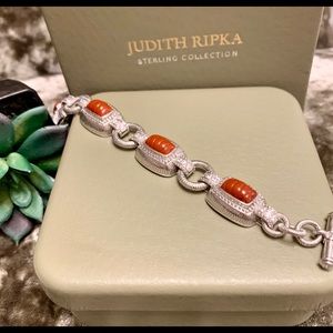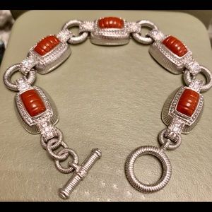 ⭐️bracelet is comprised of vertically carved east west set coral stones bezel at with ribbing and beadwork. encrusted with 27 diamonique stones.