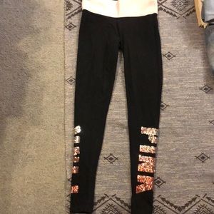 Black yoga pants sequenced PINK on the bottom of both legs. Pink band