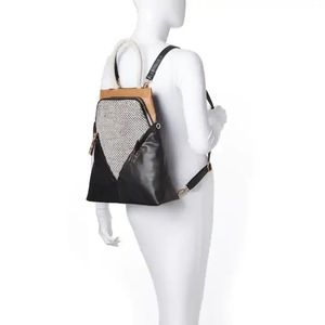 Smooth and textured faux leather. Has detachable/adjustable straps to use as backpack-style. Zip closure. 13" w x 15" h x 3 1/2" d. Fabric and synthetic.