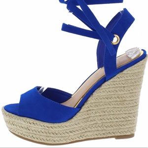 Royal blue and tan espadrille ankle wrap wedges for summer. Very cute, comfortable and easy to walk. Can be dressed up or down. Great for a brunch with the girls, casual date night or shopping. Open toe and easy to slip on. These heels are soo worth it! Made by Liliana.