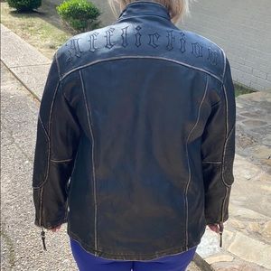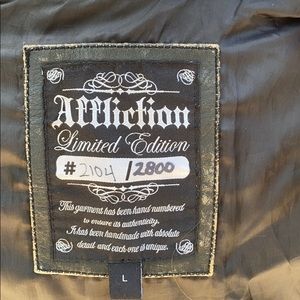 Black leather affliction jacket with skull accents zippers with embroidered skulls on front and affliction on the back. Number 2104 of 2800