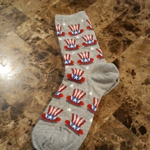 Adorable patriotic socks, great for the Fourth July. The socks have a red,white and blue hat,white stars on a gray background.