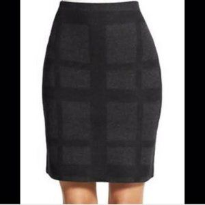 Eileen Fischer charcoal grey and black plaid pattern pencil skirt. 100% merino wool. Excellent Used Condition. No holes, stains, flaws...Looks great with a black blazer, white blouse paired with pumps, knee high or bootie boots. Measures: 14 1/2" waist 18 1/2" hips 19 1/2" length Hits above knee.