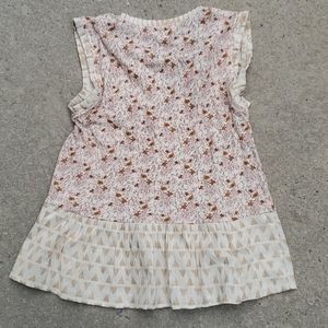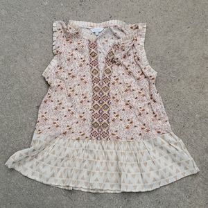 Lucky Brand mixed print boho tank top. Peplum style cream ruffle with tan triangle print. Matching pleated trim on neckline and armholes. Body is cream with brown wildflowers and a delicate pink and tumbleweed accent. Beautiful embroidery of golden yellow, olive, green, brick red edges the split neckline all the way down to the ruffle.