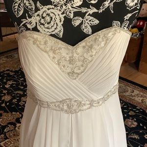 Beautiful wedding dress, worn one time, ivory Grecian style. Gathered baddest features delicate beadwork. Bust measures 19 inches from armpit to armpit waist measures 16 inches. Length of Train is 63 inches from the back of the waist. This is a beautiful, figure flattering, dress and would look gorgeous on any bright. Also see our listings avail, and headpiece. Bundle for a great deal