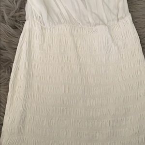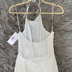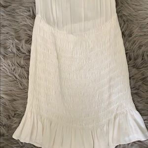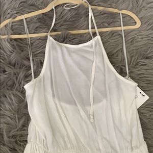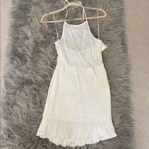 White smocked halter dress. Tie back neck. Ruffle hem.