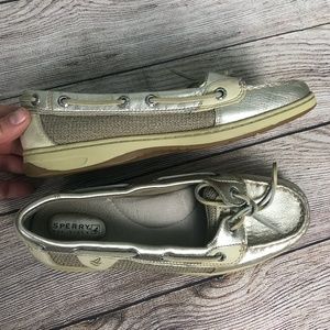 Sperry Top Sider Angelfish boat shoe metallic color. Leather. In great pre-owned condition. Some wear on rubber non marking sole.