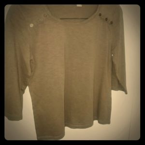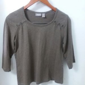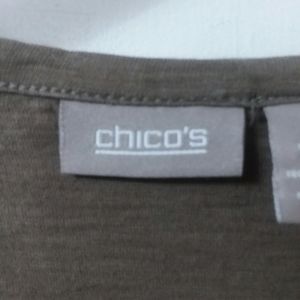 Cute little brown sweater with buttons on both sides of round collar.The size is 1 and it comes from CHICOS.It is in perfect condition with no flaws.The sweater is about 21", sleeve 15".It has been steamed and sealed before selling.