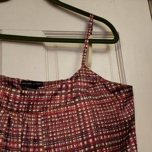 This pleated front red/black/white cami can be paired with a Jean's jacket, a white blazer or alone.