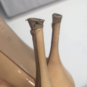 GUC, does have a couple scuffs, slight wrinkling on peep toe, and heel tips need replaced, worn down. Should be inexpensive fix.